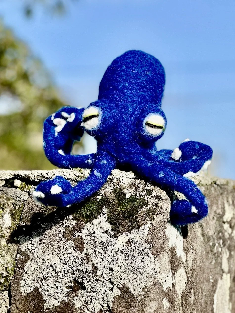Azorean wool felt octopuses honor local sea life. Angélique use local wool and traditional felting to craft soft, sturdy octopuses with flowing arms, textured skin, and lively expressions.