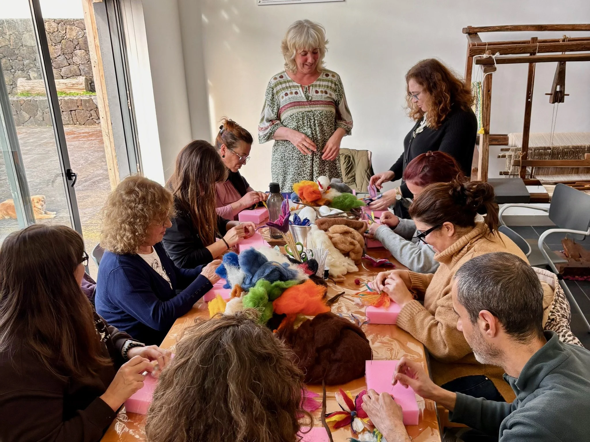 From March 25–26, 2026, Angélique Verdel, in collaboration with the Ecomuseum Corvo, led a workshop on the small island of Corvo (Azores) that combined wet felting and needle felting. The island has a long sheep‑farming tradition: about 600 sheep now live free in the Caldeirão crater. In the past, the roughly 400 residents yearly celebrated “Wool Day.” Ten participants learned alongside Angélique, owner of Azoreswool, how to create felt flowers and Easter decorations.